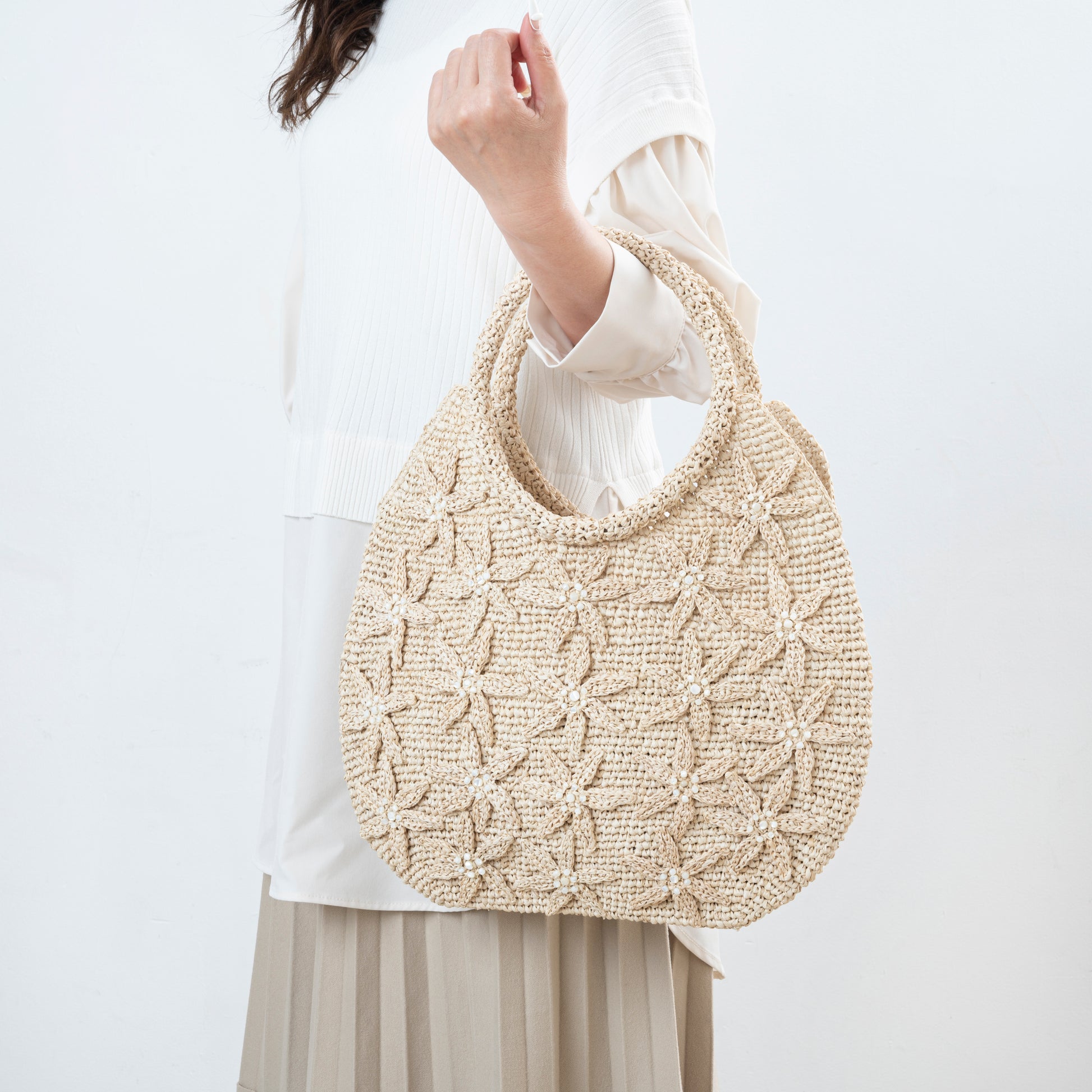 Woven slowly by skilled hands, this raffia bag feels less like an accessory and more like a small piece of nature carried with you. Soft spirals of hand-crocheted raffia rise gently across the surface, blooming like flowers caught in a moment of stillness. The natural fibers bring warmth and subtle texture, while the flowing fringe at the base moves with every step—light, organic, and alive.