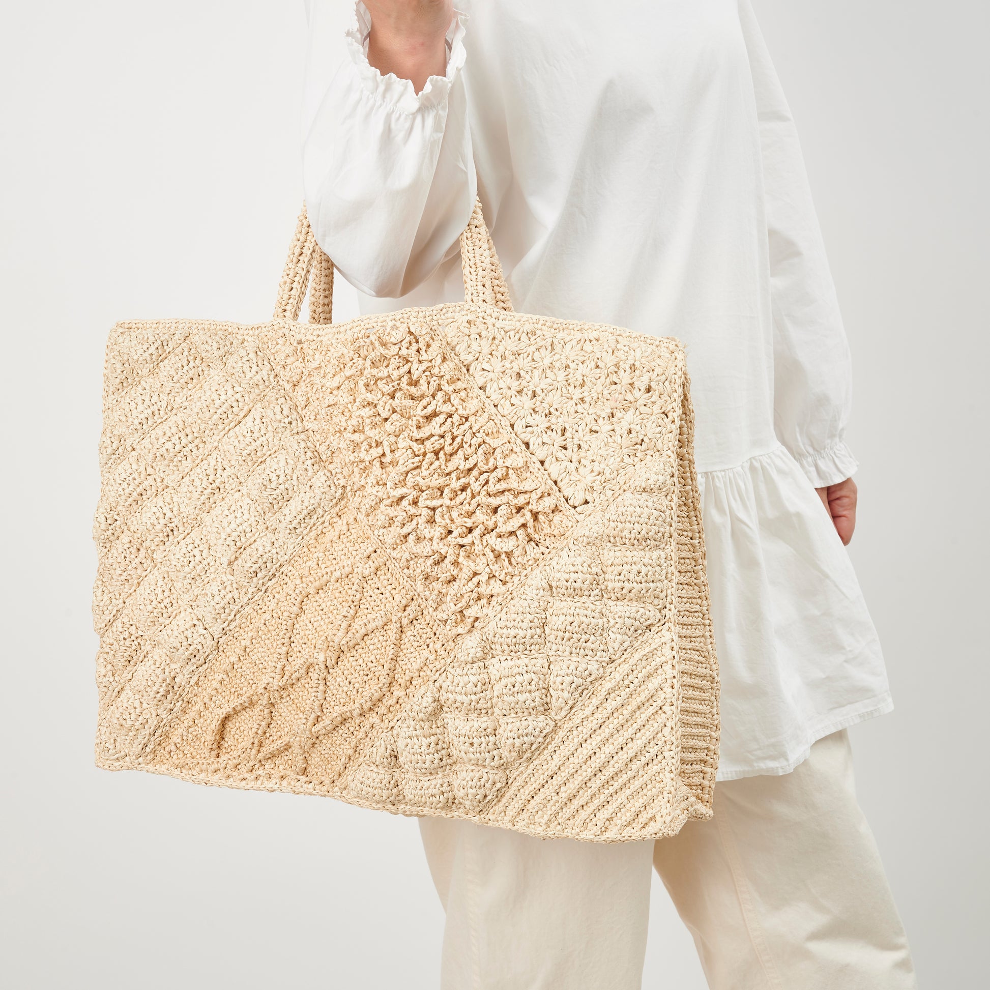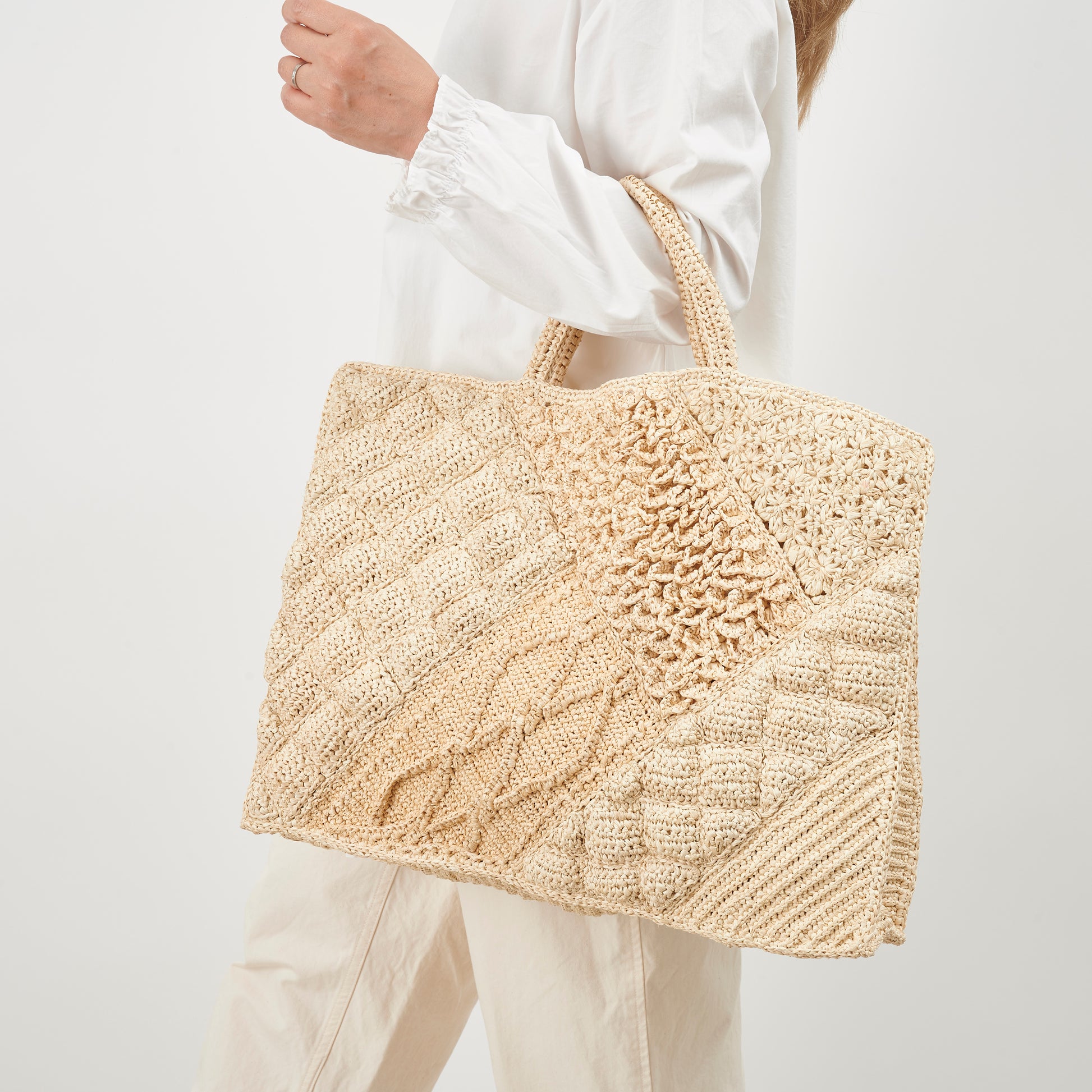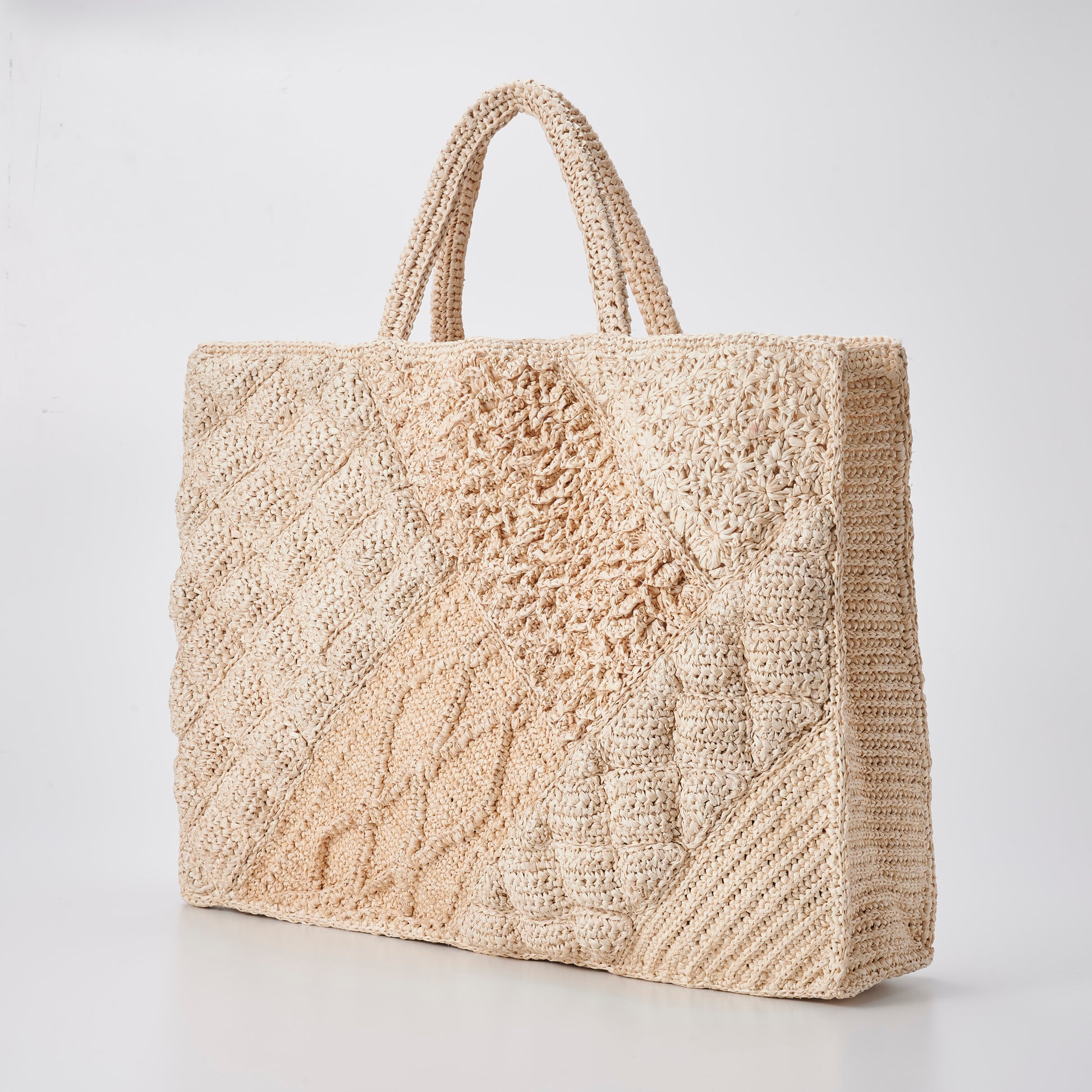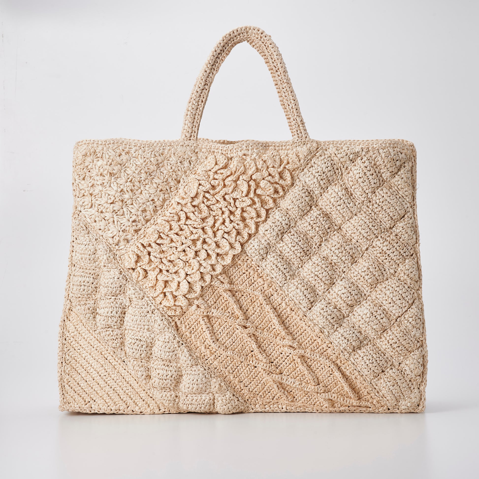Composed like a textile mosaic, the Mosaic Weave Raffia Bag brings together a rich variety of crochet patterns into a single, harmonious form. Each section is hand-crocheted using a different stitch and texture—dense, open, raised, and flowing—creating a surface that invites both touch and attention.