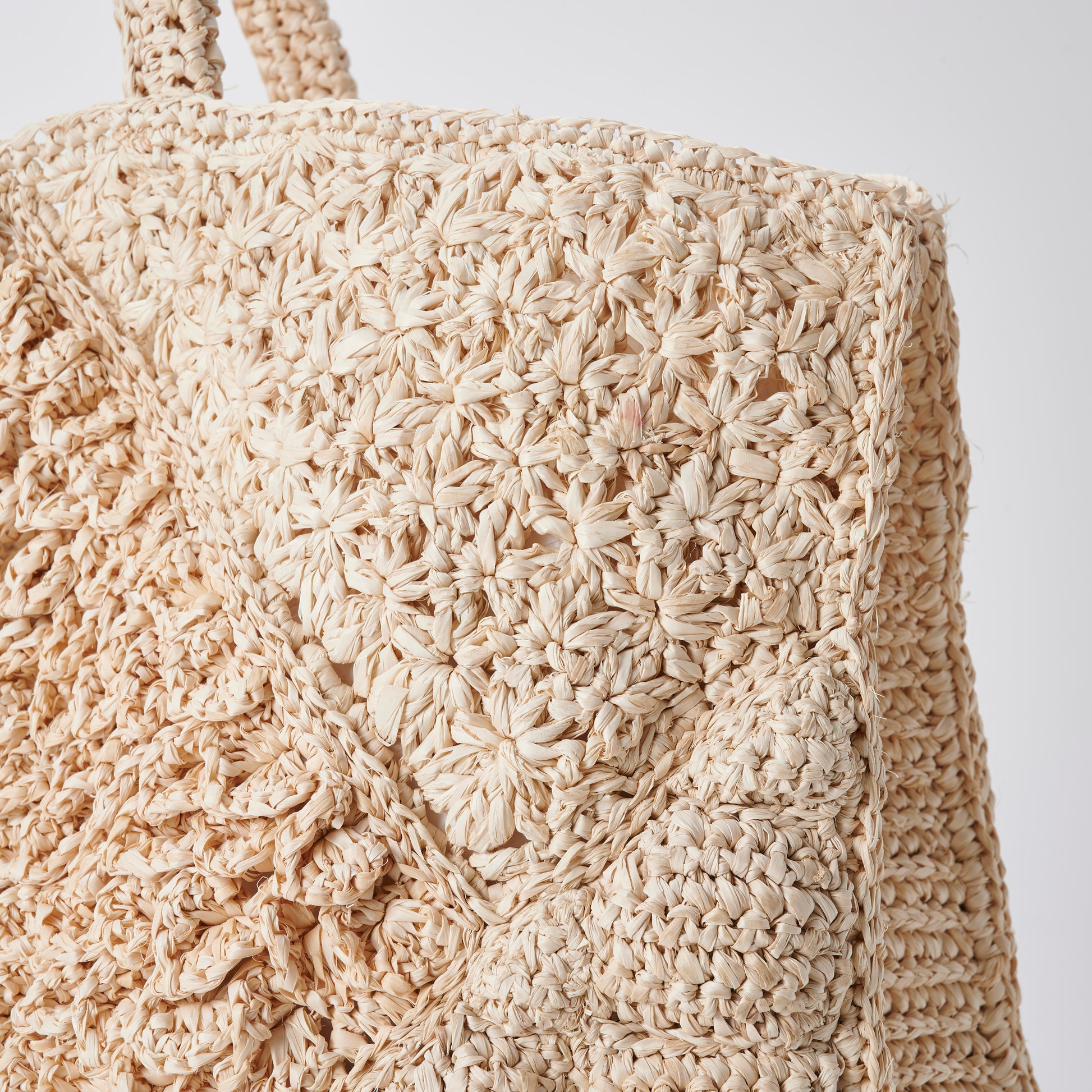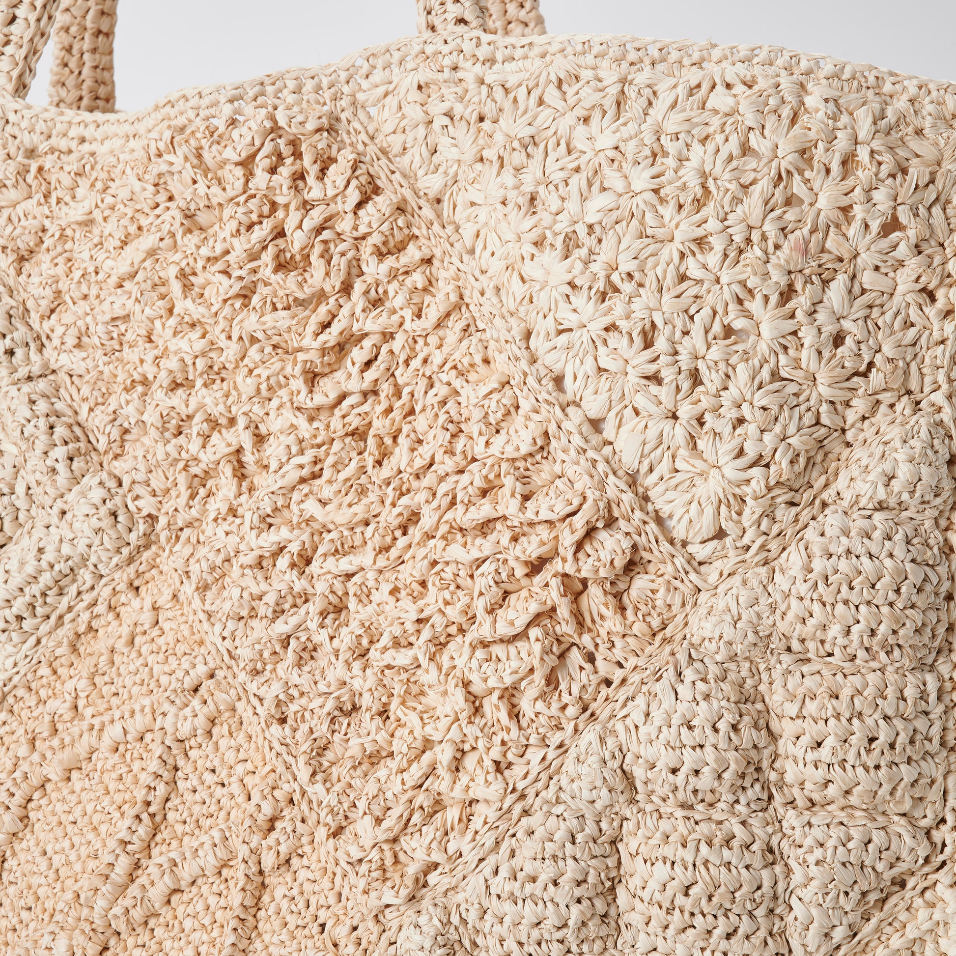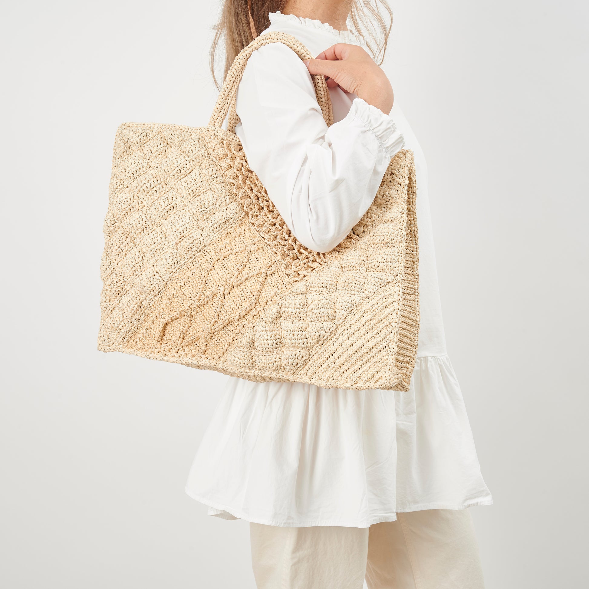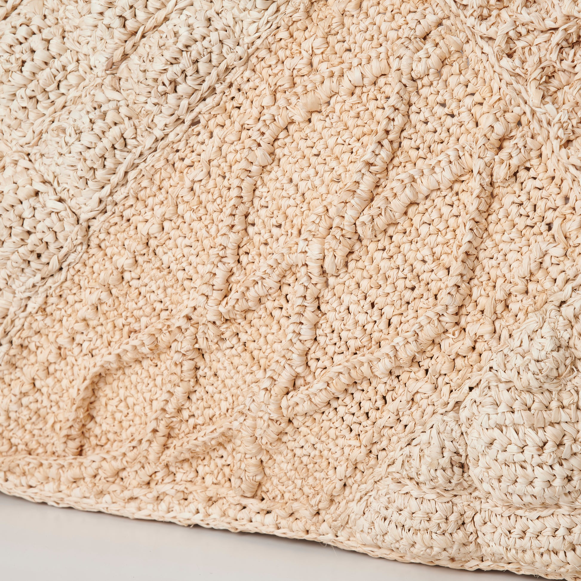 Composed like a textile mosaic, the Mosaic Weave Raffia Bag brings together a rich variety of crochet patterns into a single, harmonious form. Each section is hand-crocheted using a different stitch and texture—dense, open, raised, and flowing—creating a surface that invites both touch and attention.