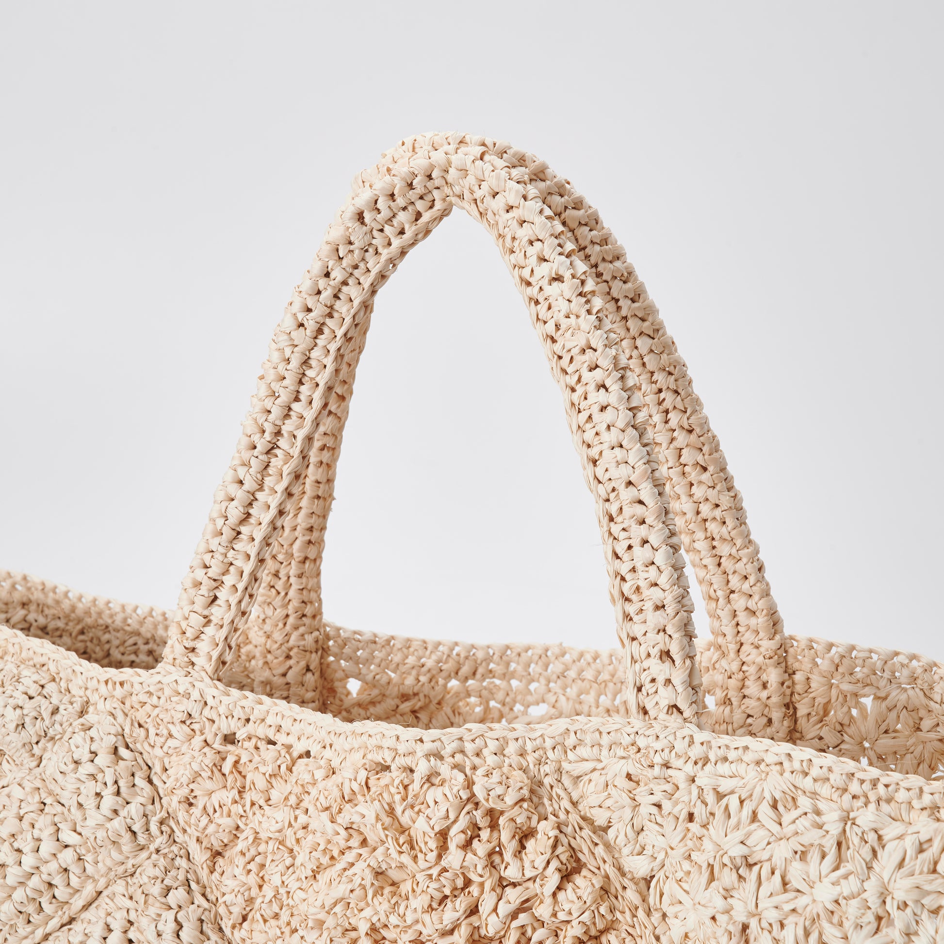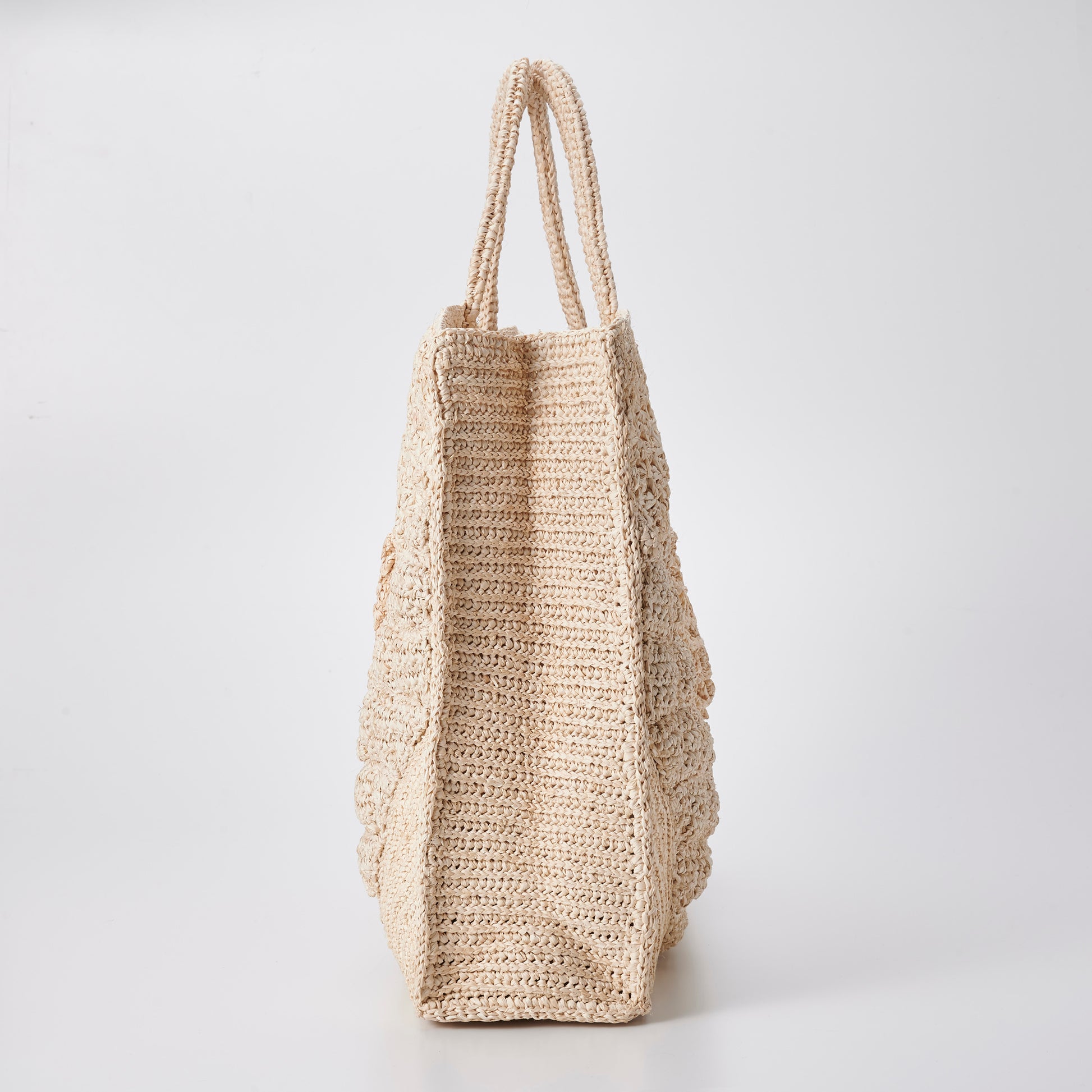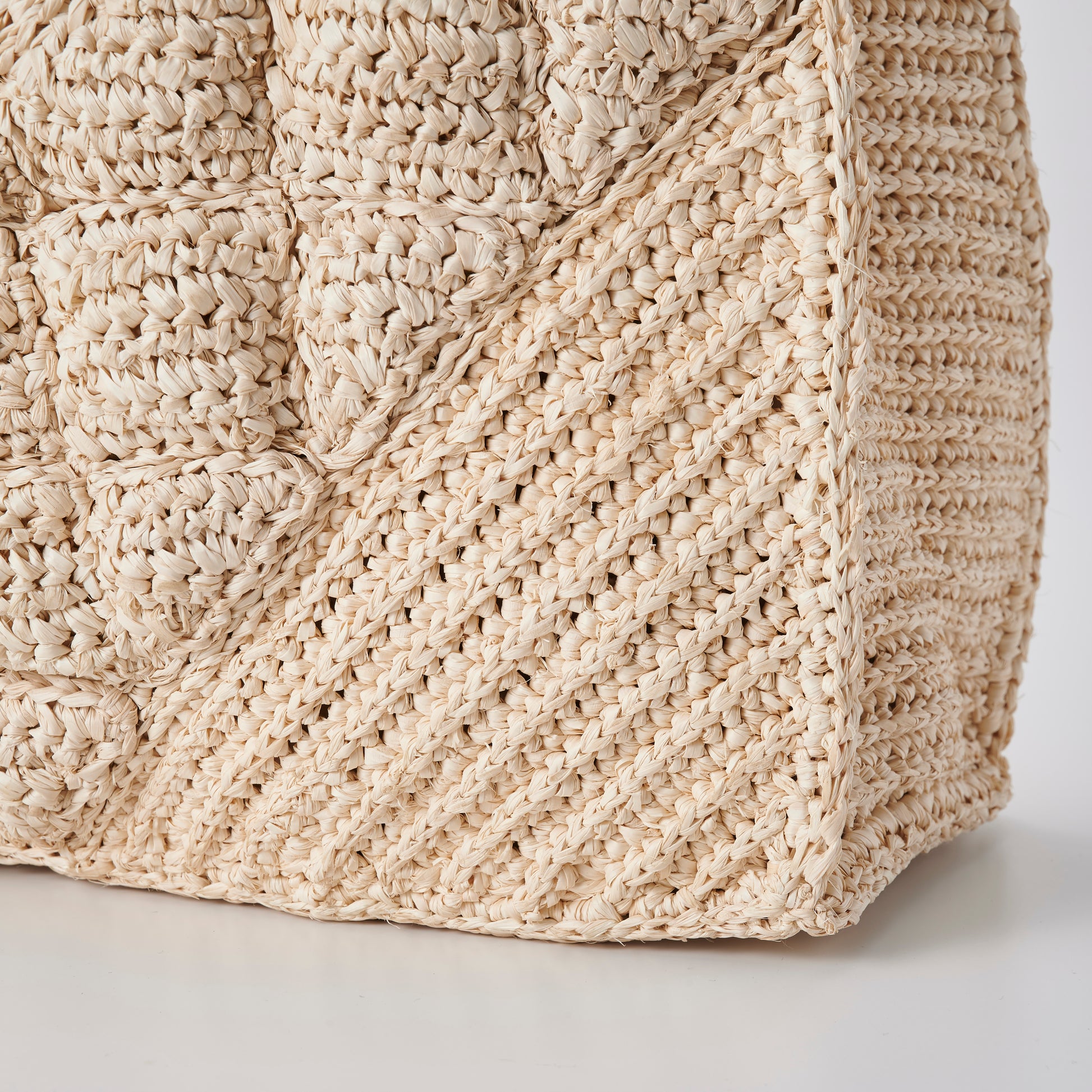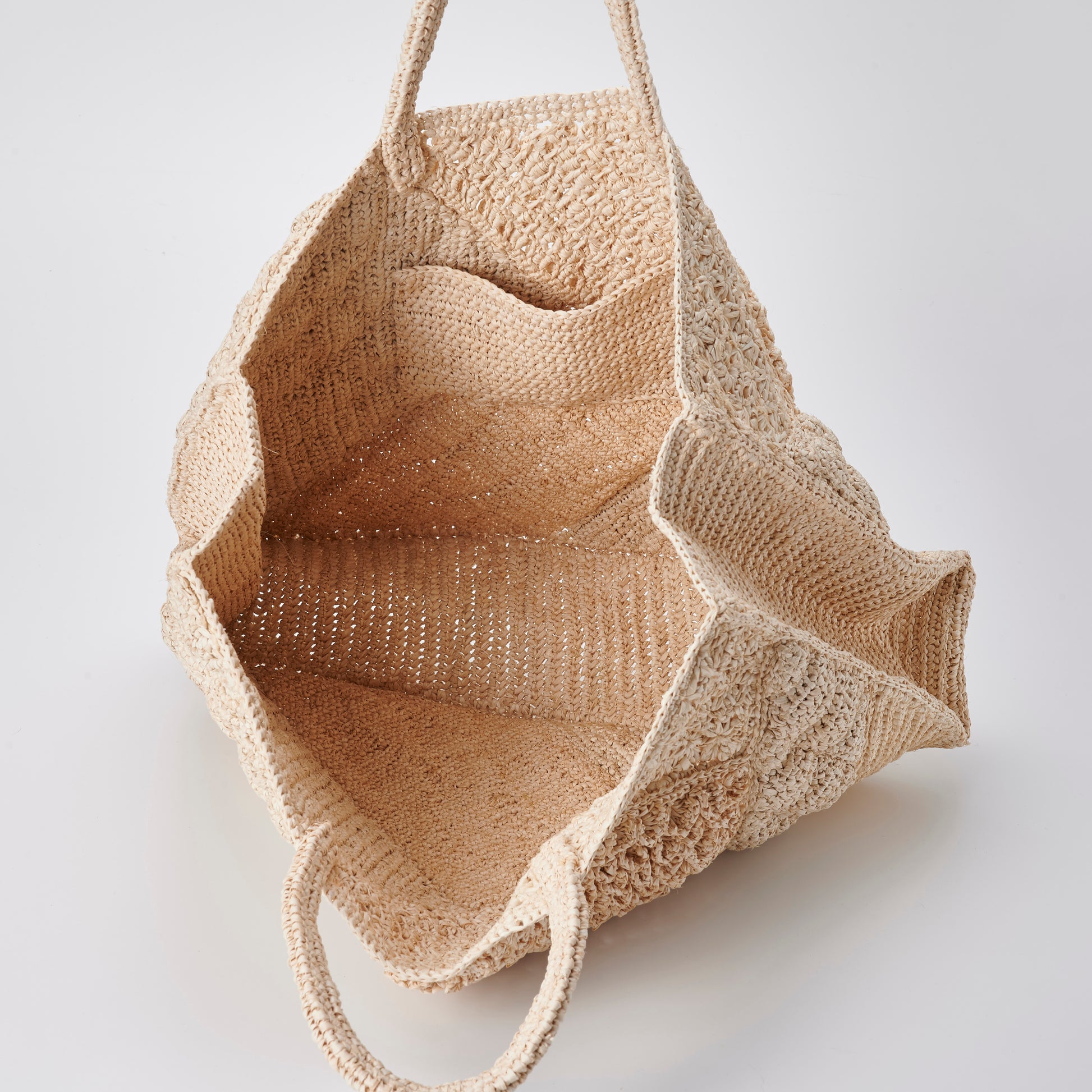 Composed like a textile mosaic, the Mosaic Weave Raffia Bag brings together a rich variety of crochet patterns into a single, harmonious form. Each section is hand-crocheted using a different stitch and texture—dense, open, raised, and flowing—creating a surface that invites both touch and attention.