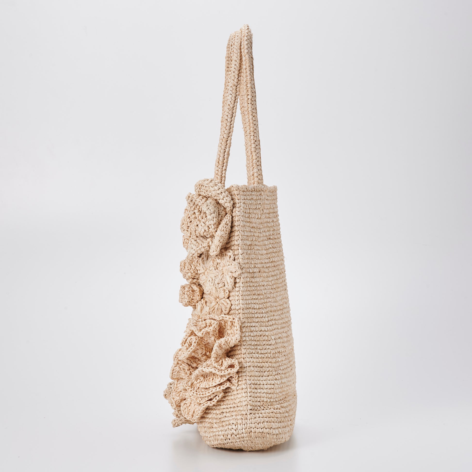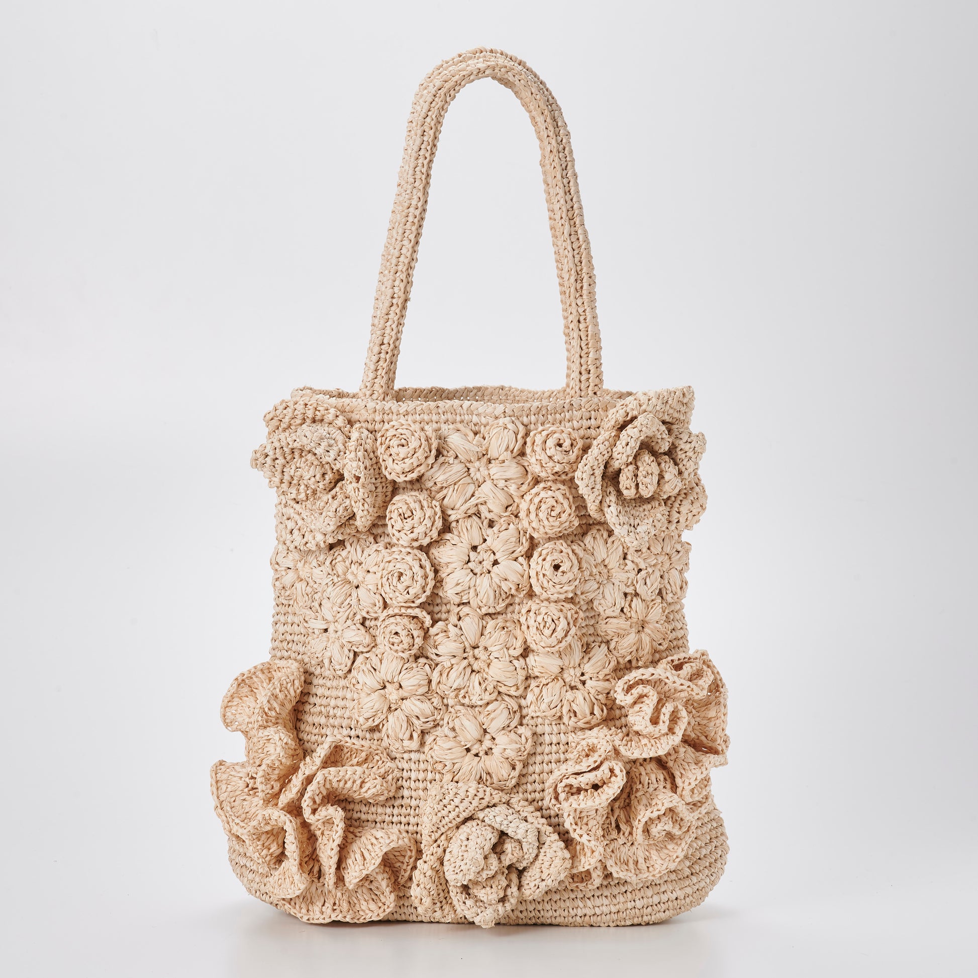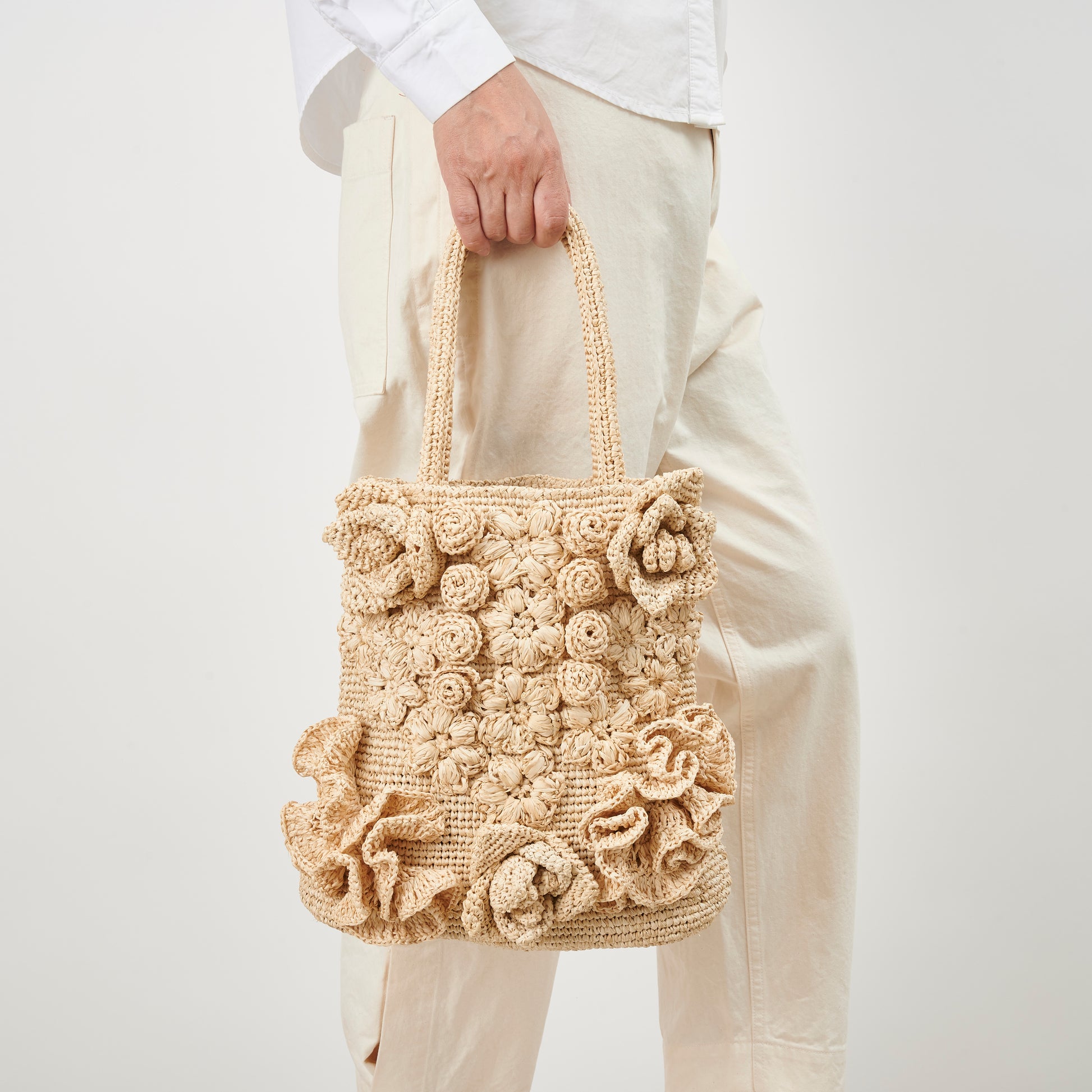 Balanced by a simple vertical silhouette and sturdy shoulder handles, the bag is both expressive and practical. With time and use, the raffia softens and deepens in tone, allowing the flowers to mature beautifully—just like a garden that changes with the seasons.