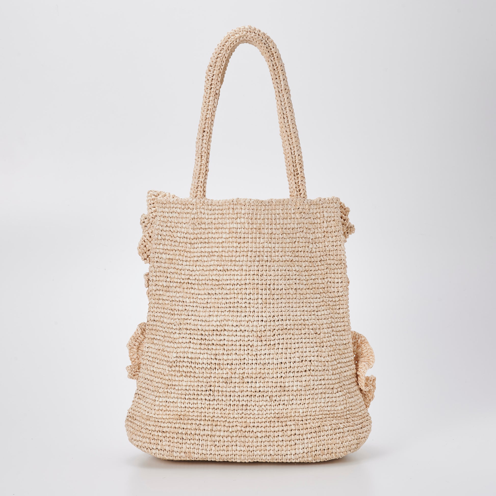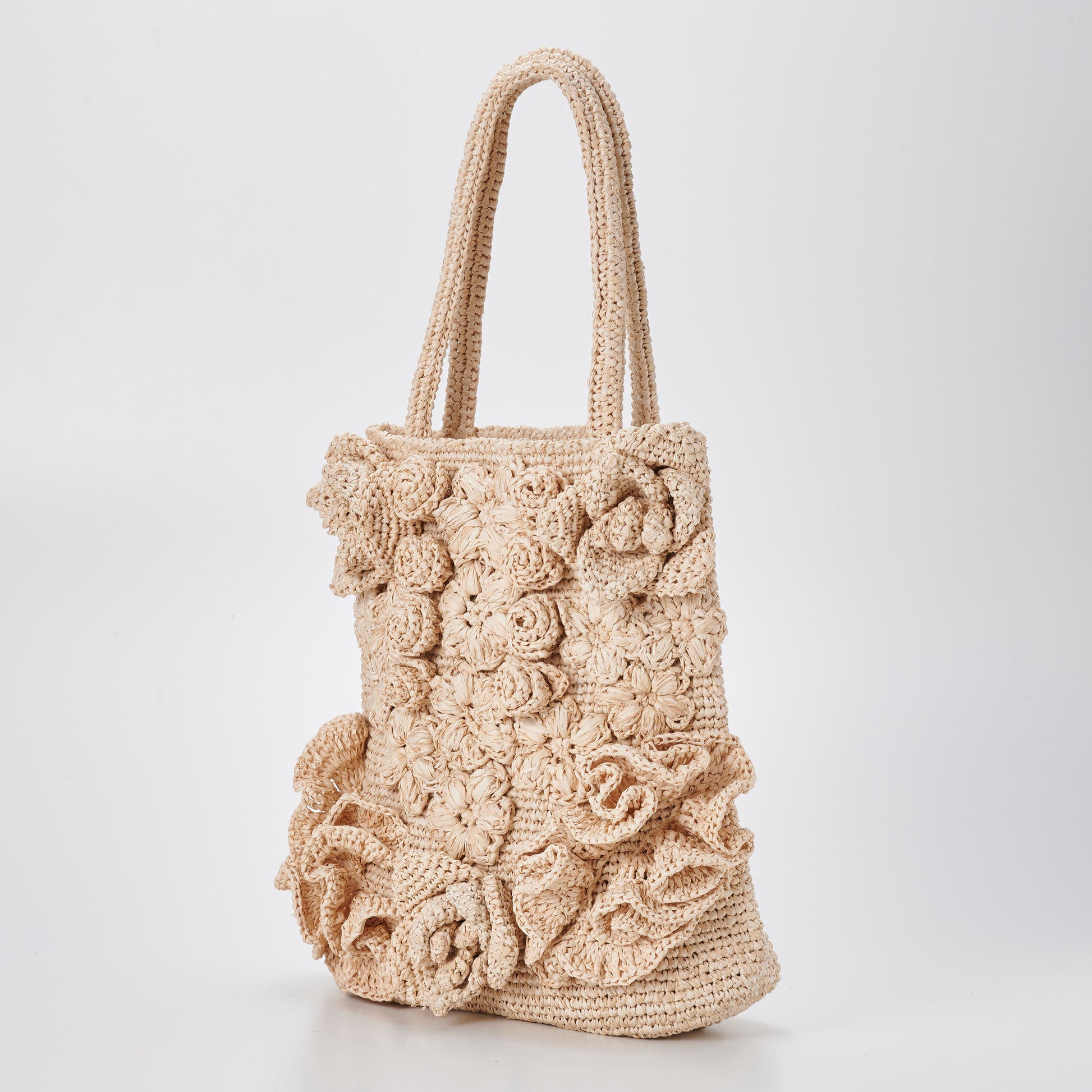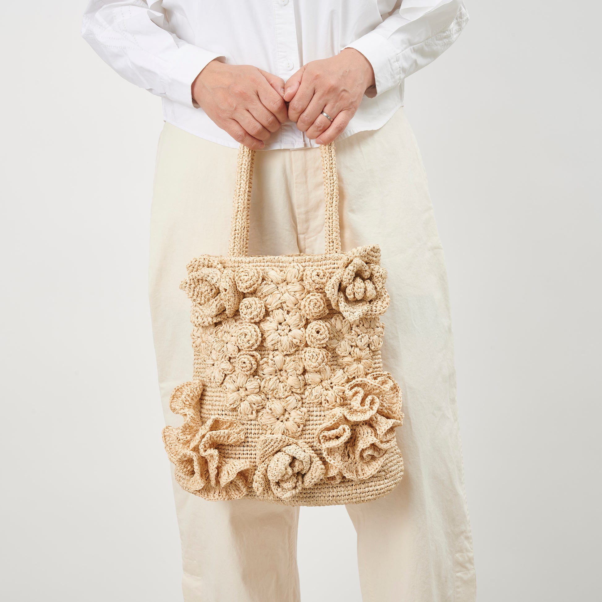 Balanced by a simple vertical silhouette and sturdy shoulder handles, the bag is both expressive and practical. With time and use, the raffia softens and deepens in tone, allowing the flowers to mature beautifully—just like a garden that changes with the seasons.