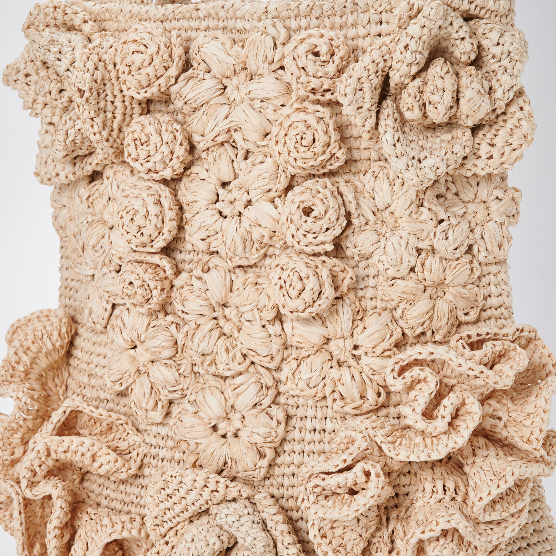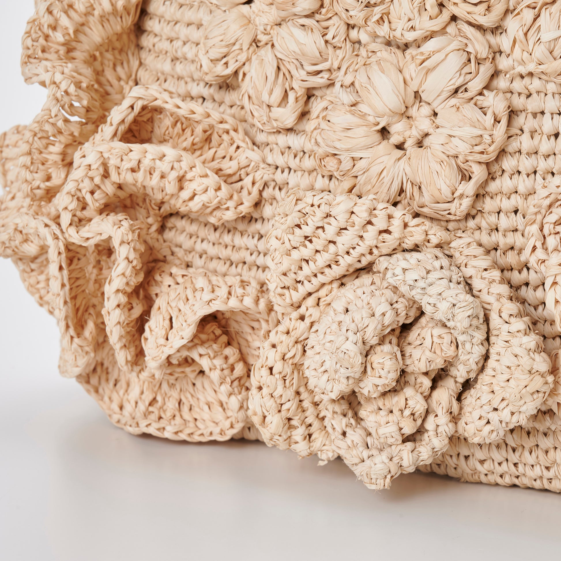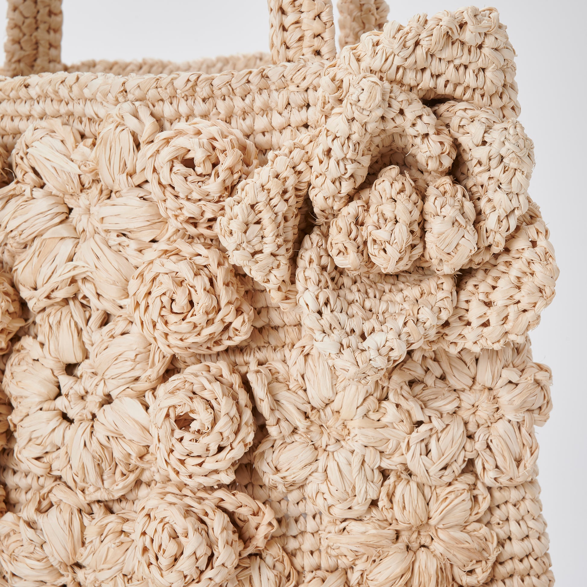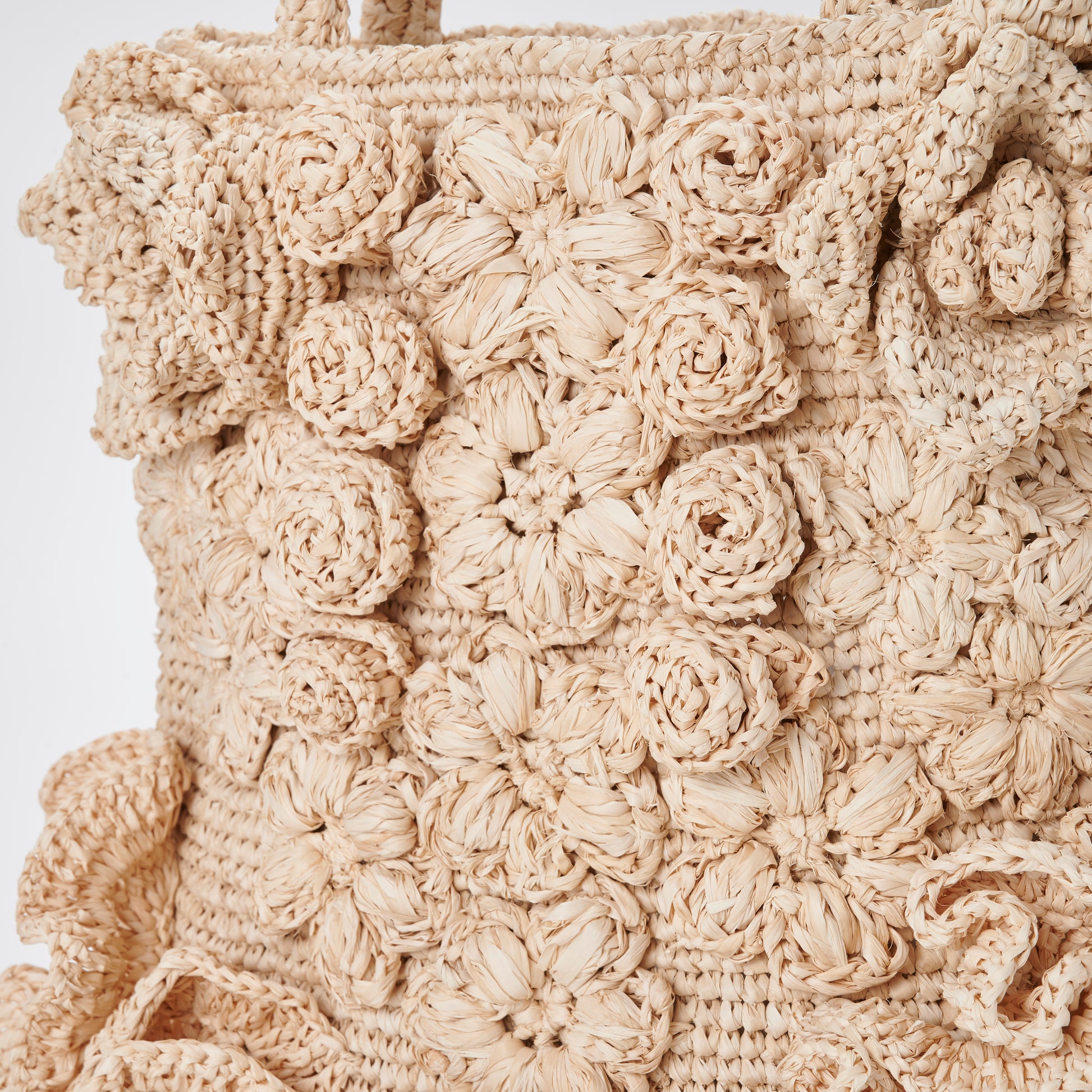 Every motif is hand-crocheted from natural raffia, giving the bag a richly layered texture that invites touch. The mix of floral styles and stitching techniques reflects the charm of folk craft, where variation is celebrated and perfection is never the goal. No two bags are ever the same; each carries the quiet individuality of the artisan who made it.