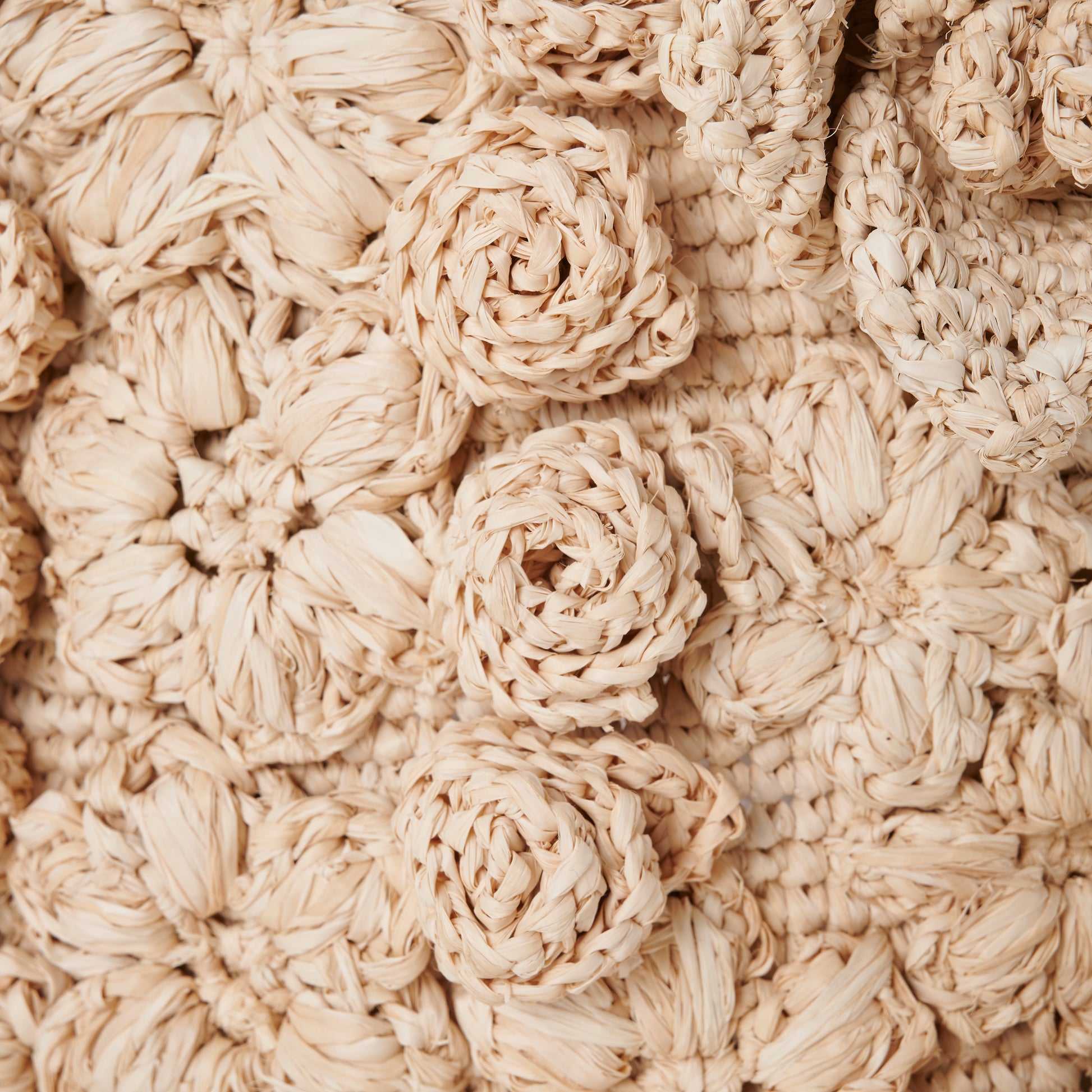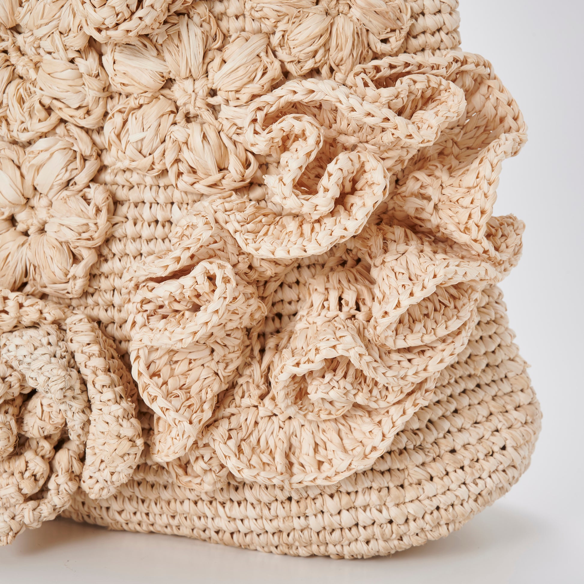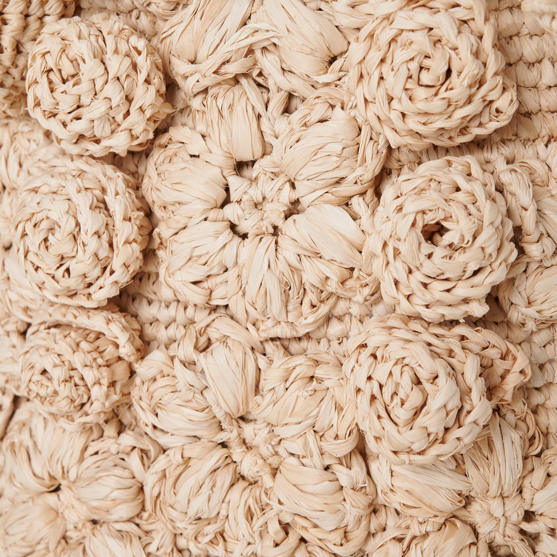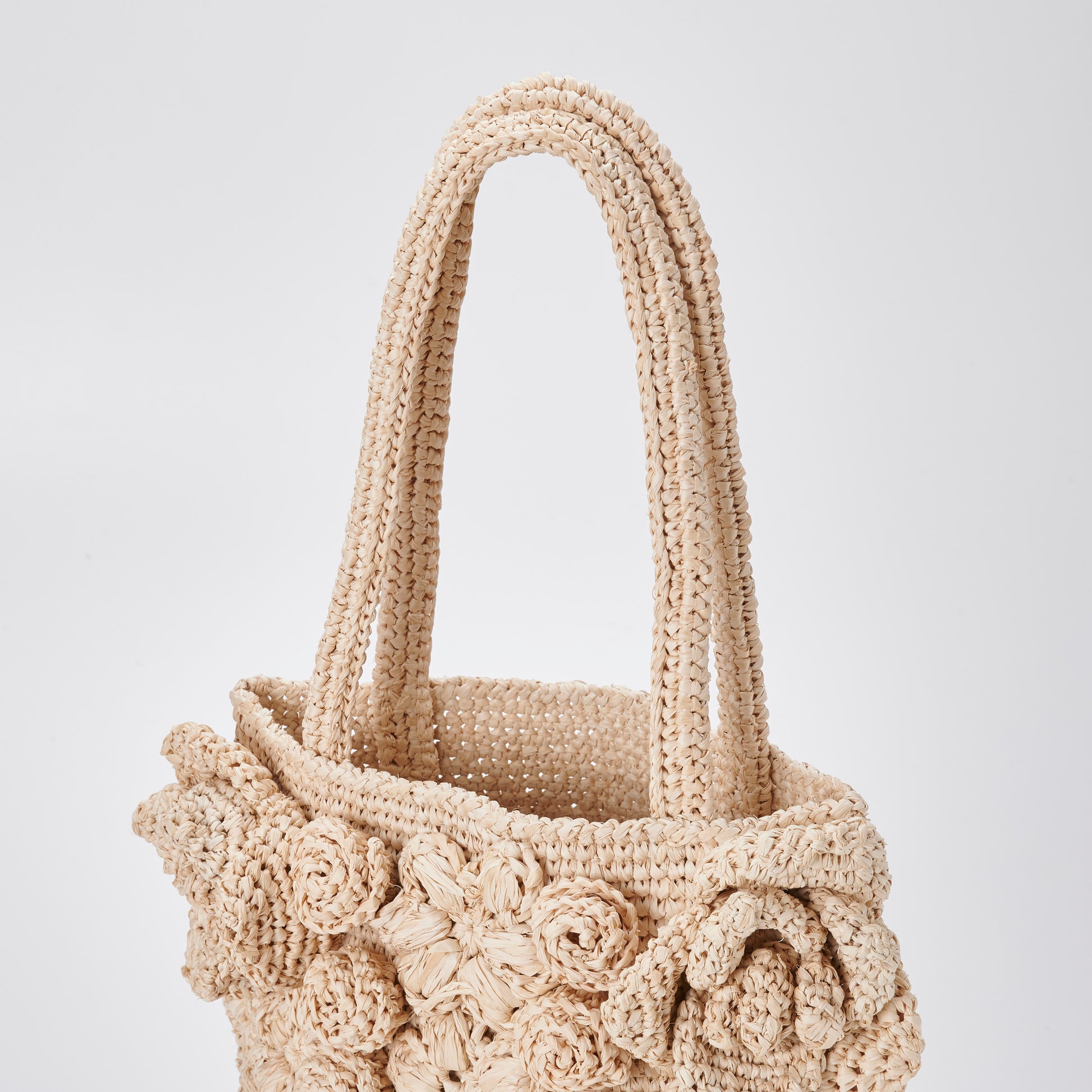 Every motif is hand-crocheted from natural raffia, giving the bag a richly layered texture that invites touch. The mix of floral styles and stitching techniques reflects the charm of folk craft, where variation is celebrated and perfection is never the goal. No two bags are ever the same; each carries the quiet individuality of the artisan who made it.