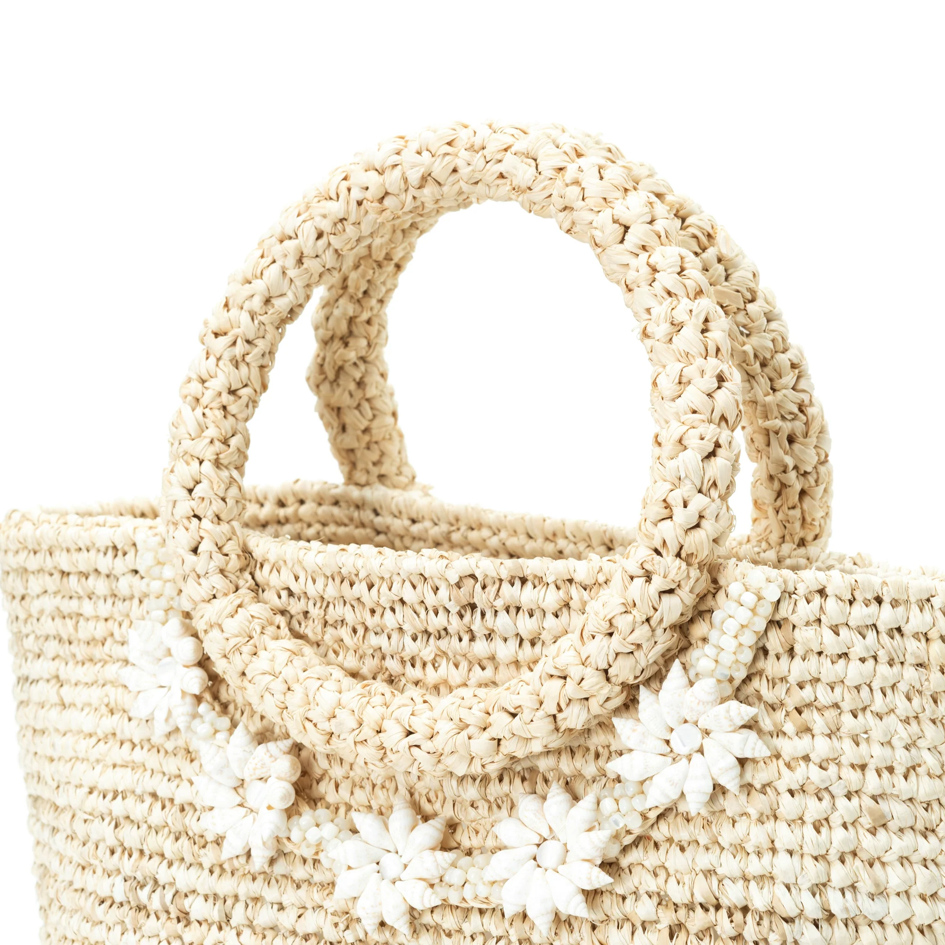 .Skilled artisans have carefully crafted each shell bead by hand, making it a product that requires much time and effort. The sturdy handle, reinforced with tubing, has a soft, round shape that adds a charming impression. The bag has a bottom gusset, allowing it to stand on its own. Comes with a pocket and a girl's charm.